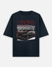 The artwork shows a blacked-out GTR cruising through a neon-lit city scene, paired with bold Japanese typography that reflects underground street racing culture. The oversized fit gives you a relaxed silhouette while keeping the look sharp and intentional.